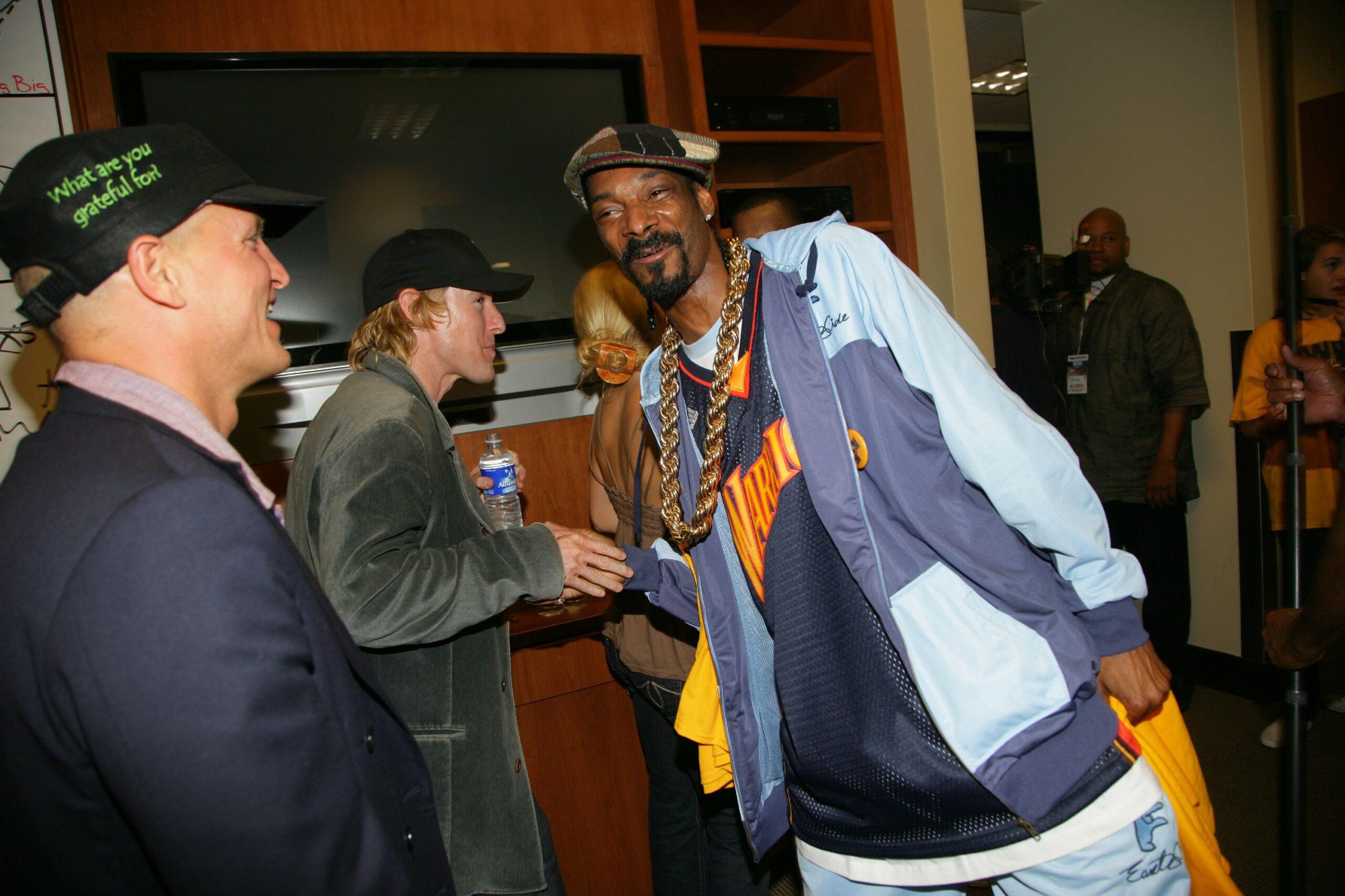 According to a 2019 San Francisco Gate story, “Legendary California rapper, actor, and entrepreneur Snoop Dogg is a recurring spectator at Golden State Warriors playoff games—even though he’s from Southern California and also reps the Los Angeles Lakers. He’s been seen at Warriors playoff games since at least the ‘We Believe’ era, [and] was seen hanging with Vallejo rapper E-40 at the Warriors NBA Finals Game 5 in 2017.” Here, we see him in the aforementioned “We Believe” era, kicking back courtside in fellow L.A. native Baron Davis’s Warriors jersey and a thick gold rope. (More on that later.) He doesn’t look unhappy, but he’s not exactly in his groove yet.