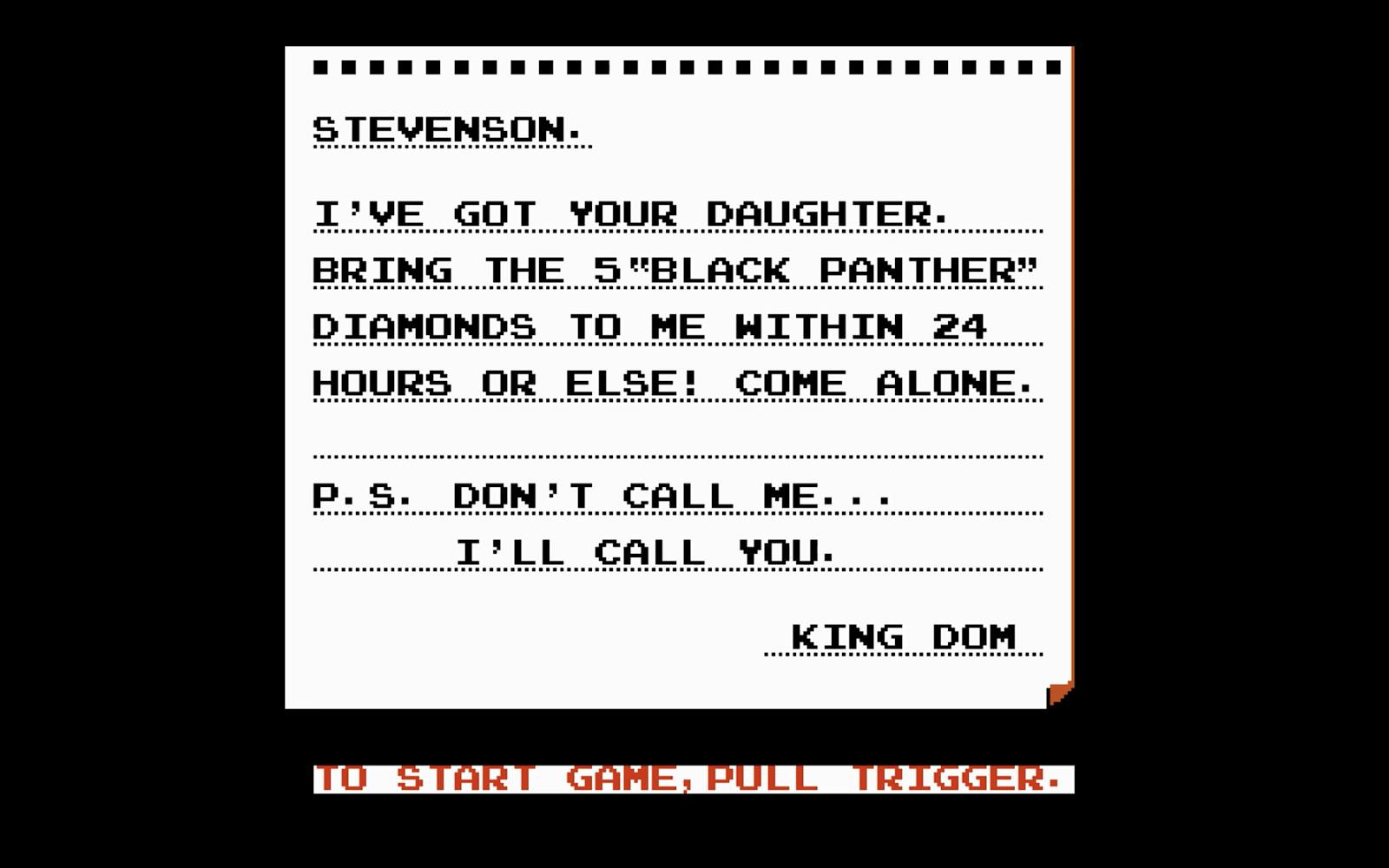 One way I know that the 21st century has poisoned me—or at least decimated my attention span—is that I used to play individual NES games for hours and hours, Duck Hunt very much included, but nowadays they can’t hold my interest for longer than 30 seconds. In Duck Hunt, you hunted ducks, or, as a special treat, clay pigeons. (Also, there were more trees on that screen.) That’s it. And this was a launch game, bundled with the beloved system itself; when Super Mario Bros. quickly emerged as the best NES game by orders of magnitude, Nintendo came out with a mega-popular Super Mario–Duck Hunt combo cartridge, Duck Hunt the Garfunkel to Mario’s Simon, the Oates to his Hall. No way was it even the best NES Zapper game, that honor going to either the gritty shooting gallery Hogan’s Alley or the bizarre but similarly noirish Gumshoe, which required you to incessantly shoot a trenchcoat-clad detective so he could remain airborne and snag red balloons, and which featured my second-favorite NES intro screen.
