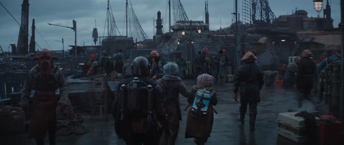 Disney didn’t divulge that Baby Yoda existed until fans discovered the secret for themselves on the screen. Unsurprisingly, the people who pulled off that improbable feat of spoiler prevention are still playing their sabacc cards close to the vest. The trailer looks great, showcasing the variety in terrain that makes The Mandalorian a feast for the eyes and a treat for galactic tourists. We see a bantha and a Tusken Raider riding on what appears to be Tatooine, in addition to shots of a water world that could be Mon Cala (judging by the tentacle-faced Quarren who are also native to Admiral Ackbar’s home planet) and a graffiti-filled industrial setting that’s tougher to place. The Mandalorian has repeatedly let us linger in the seedy settings that most of the Star Wars films whisk us past, and the trailer doesn’t disappointment in that department, serving up a crowded dock, a banged-up barge, and a roomful of unsavory sorts (including cycloptic Abyssin Gore Koresh) watching and wagering on Gamorrean duelists.