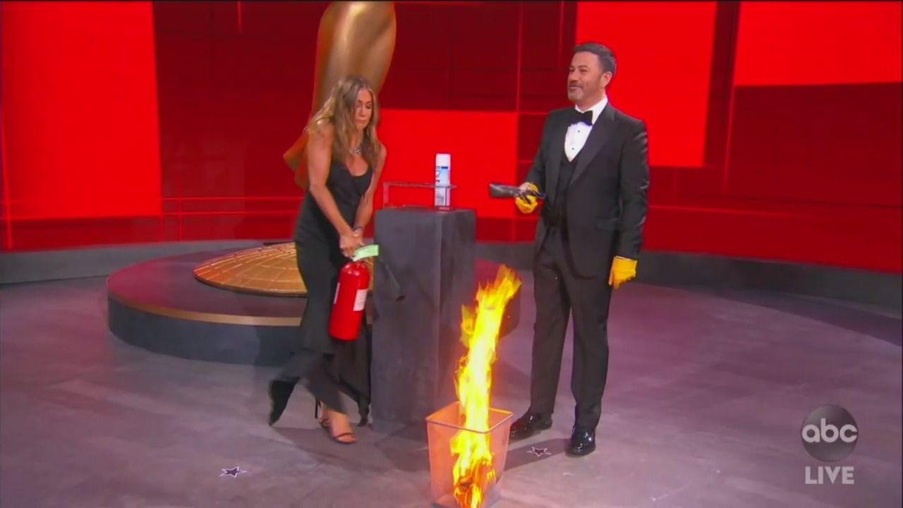 Anyway, given the circumstances, Kimmel crafted a memorable opening and had some helpful assists throughout the evening—shout-out to Randall Park and the alpaca gnawing on his suit jacket. That said, the night’s funniest moments were often the most spontaneous: When Kimmel and Jennifer Aniston needed multiple attempts to extinguish a flaming Emmys envelope, well, that’s live television baby.