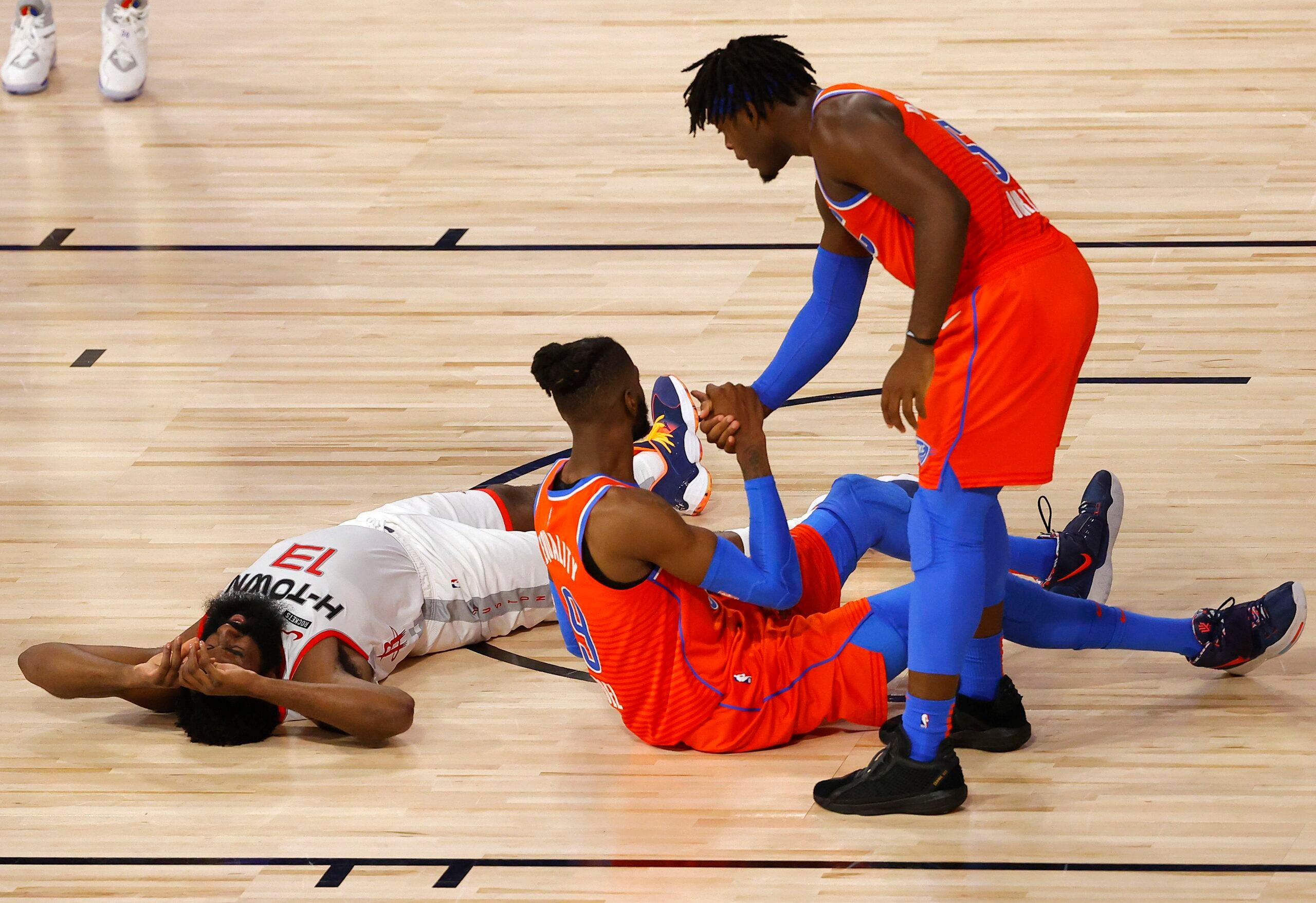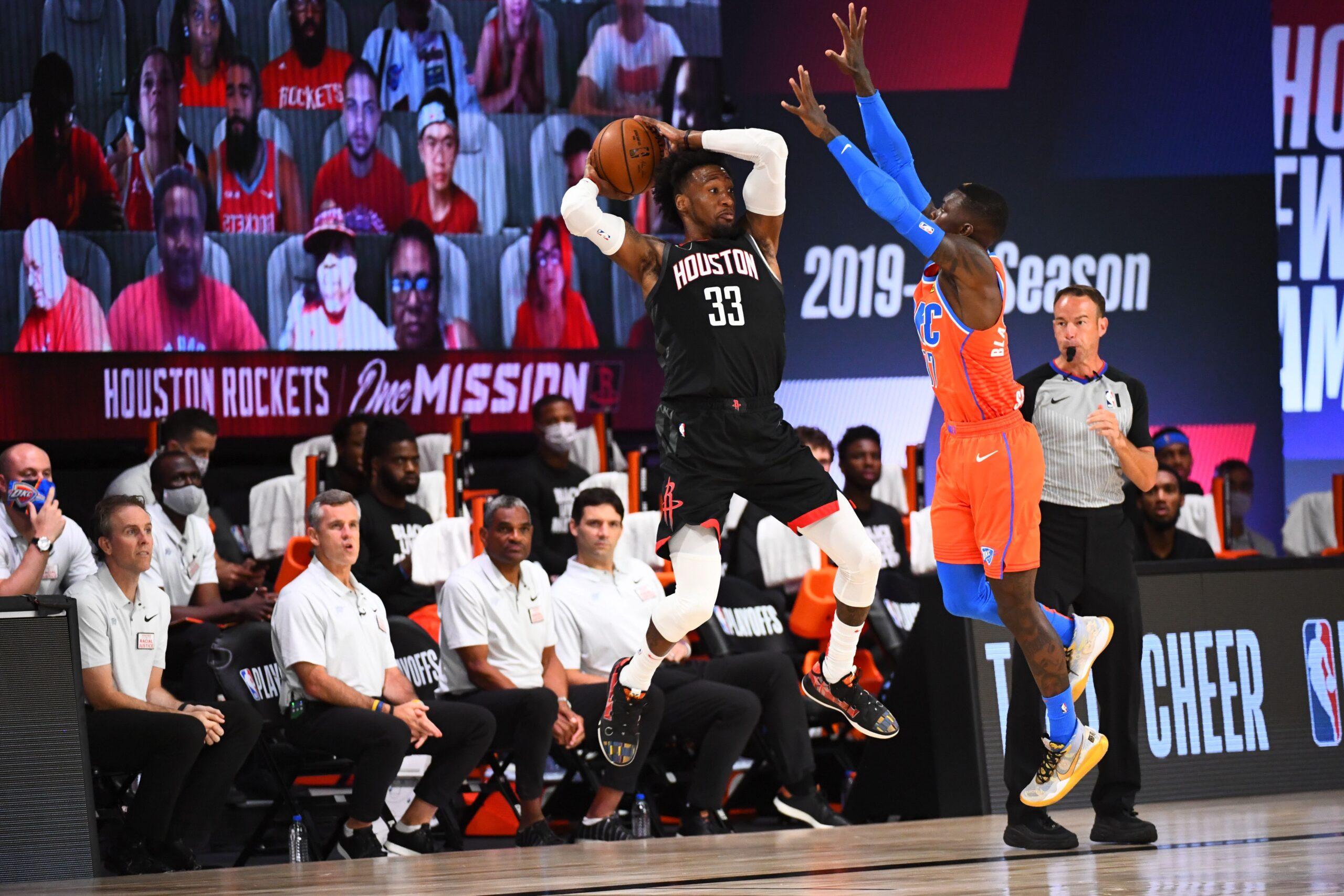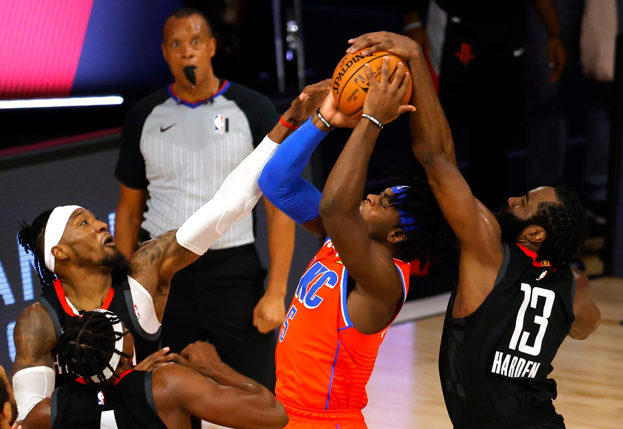 The Rockets, who quietly posted the league’s third-stingiest defense in the bubble before their meaningless seeding-game finale against Philadelphia, built a 17-point lead less than three minutes into the second quarter by using their switching scheme to short-circuit Oklahoma City’s offense into stagnation. Danilo Gallinari (29 points in 33 minutes) went to work against Houston’s shorter defenders, and Steven Adams (17 points, 12 rebounds, four on the offensive glass) occasionally made his presence felt on the interior. But the three-headed monster of Chris Paul, Shai Gilgeous-Alexander, and Dennis Schröder couldn’t penetrate Houston’s shell for most of the night, resulting in a host of aimless possessions and low-percentage heaves against the P.J. Tucker–and–Robert Covington–led defense; OKC’s top ball handlers combined to shoot 5-for-19 in the first half as the Rockets built a double-digit lead it would never relinquish.