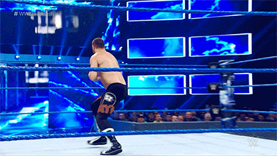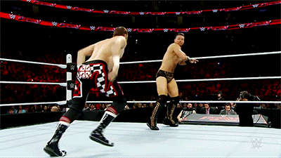 An idiosyncratic flourish of Zayn’s is that if his opponent moves out of the way, he’ll turn it into a fancy backflip back into the ring instead.