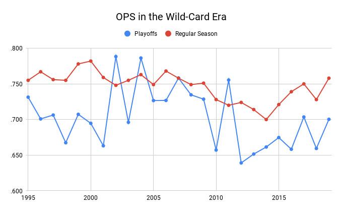 In the wild-card era, scoring has dropped by about 10 percent in the postseason, from an average of 4.64 runs per game in the regular season to 4.17 in the playoffs. Batting lines have fallen from .261/.330/.417 in the regular season to .241/.314/.389 in the playoffs, an OPS drop of 44 points. (For reference, .241/.314/.389 is roughly the career slash line of backup catcher Jason Castro.)