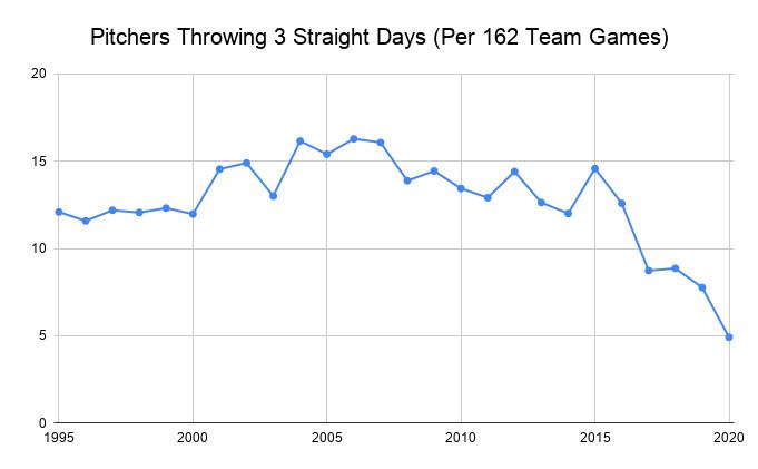 This change also comes amid a broader league context of greater respect for rest. In the mid-2000s, the average team used a pitcher on three consecutive days about 16 times over the course of the regular season; by last year, that rate had been cut in half, to just eight per team, and it’s dropped even more in 2020 (even translating to a 162-game calendar).