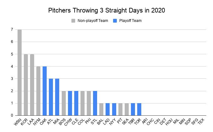 In 2020, no playoff team used a pitcher four or more days in a row during the regular season. The Twins, Astros, Cubs, Padres, Reds, and Brewers didn’t use any pitcher even three days in a row; the Rays, Yankees, Blue Jays, and Dodgers did so only once.