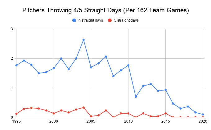 Throwing more than three days in a row also has become less common. The Angels’ Mike Mayers is the only player to pitch on four consecutive days in 2020, while nobody has pitched on five consecutive days since the final stretch of 2015, when Texas’s Sam Dyson and Shawn Tolleson each did so as the Rangers stretched for a division title. Around the same time, Oliver Pérez pitched six days in a row for the Astros, though as a lefty specialist, he faced just 10 total batters across those outings. (The MLB record, for curious readers, is an astonishing nine days in a row from Kent Tekulve in 1987.)