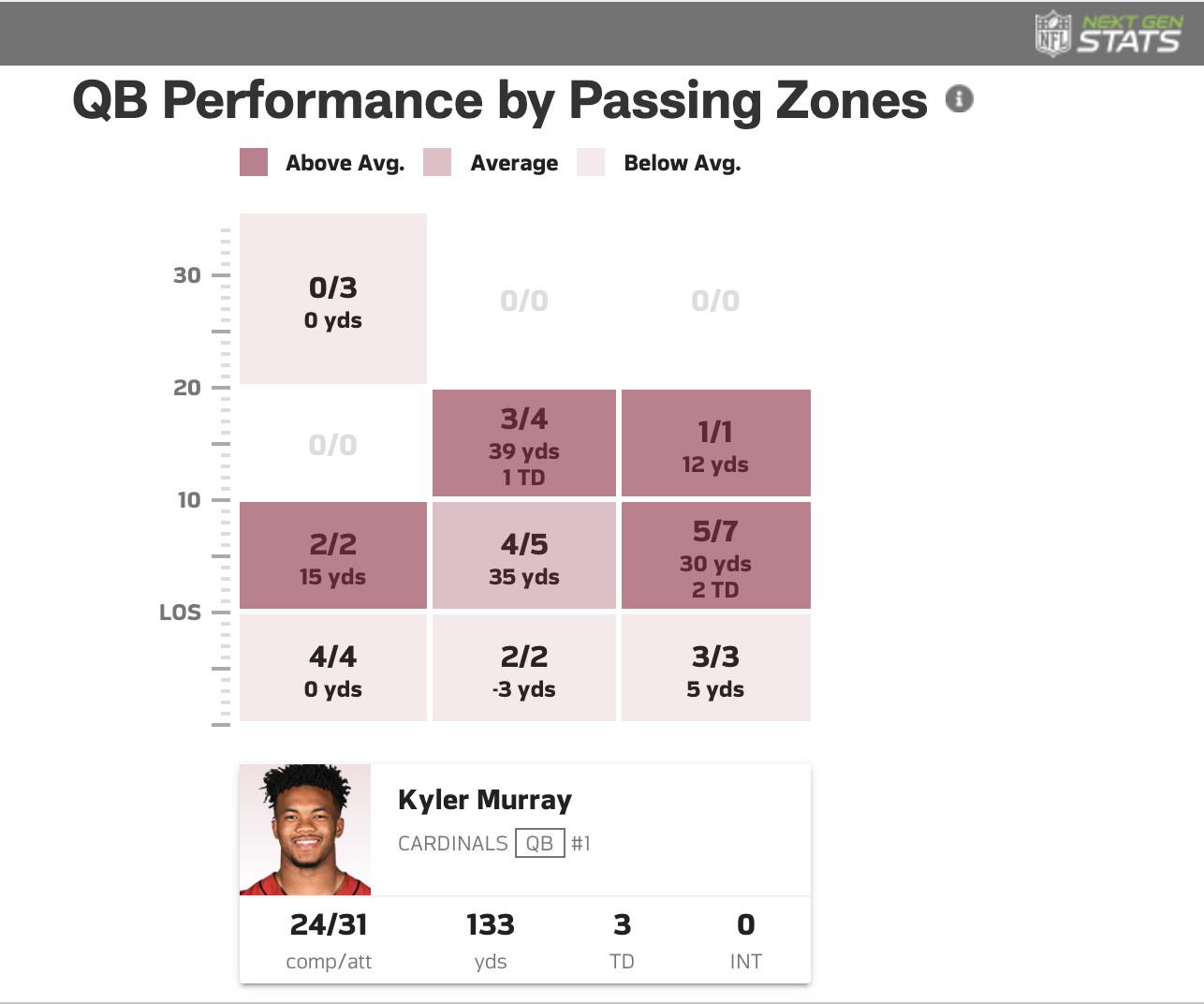 Against the Panthers, Murray virtually never attacked Carolina’s coverage downfield. Murray finished the loss 24-for-31 with 133 yards and three touchdowns. The scores look good on paper, but his measly 4.3 yards per attempt prevented the offense from achieving much. It’s just not often you’ll see a quarterback record fewer than 150 yards on more than 30 attempts.