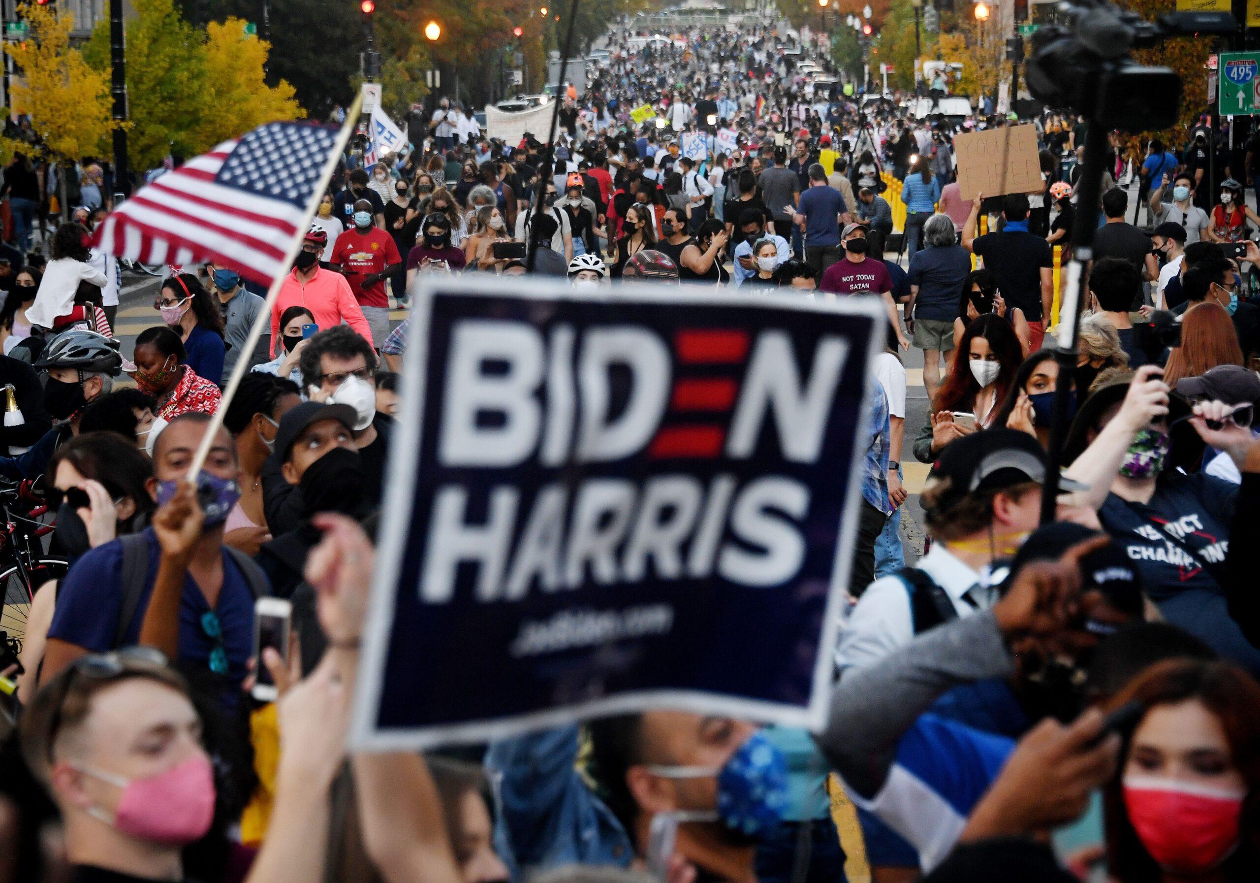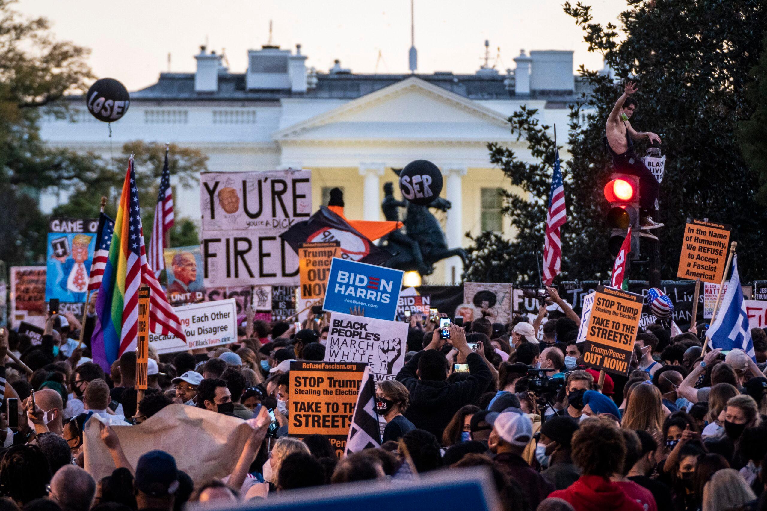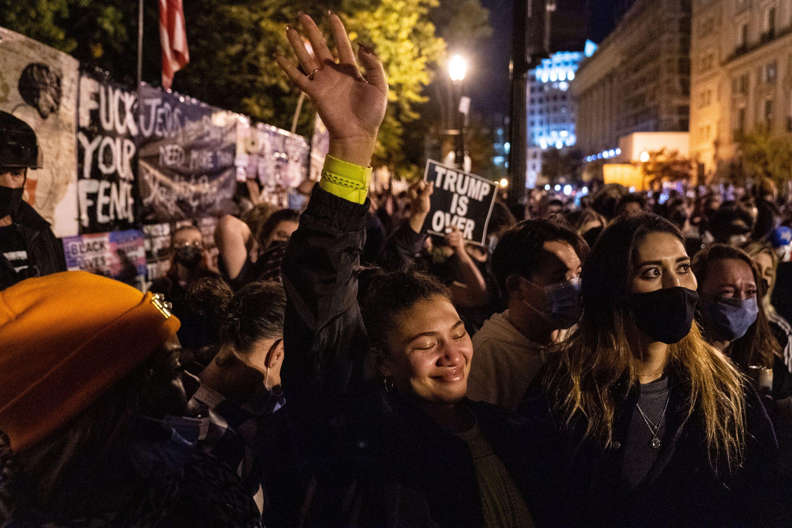 After more than four days of prolonged ballot counting in the 2020 United States presidential election, the networks announced Saturday morning that Joe Biden had defeated Donald Trump. From the moment the race was called—when it finally set in that Trump’s regime of kleptocracy and hate would last only a single term—the very look and sound of the nation’s capital shifted. People paced around the District of Columbia’s sidewalks in bunches, as if beckoned by some unnamable force. In front of the IMF’s headquarters in Northwest D.C., a line of cars grouped together, their horns blaring in unison like vuvuzelas in a soccer stadium. Passengers waved miniature American flags out of cracked windows, while onlookers recorded videos from every direction. Above nearby K and 16th streets, the volume swelled. The path leading to Black Lives Matter Plaza across the street was cut off by dirty cement roadblocks. Some were spray-painted, in deep green, with the words “Fuck Trump.”