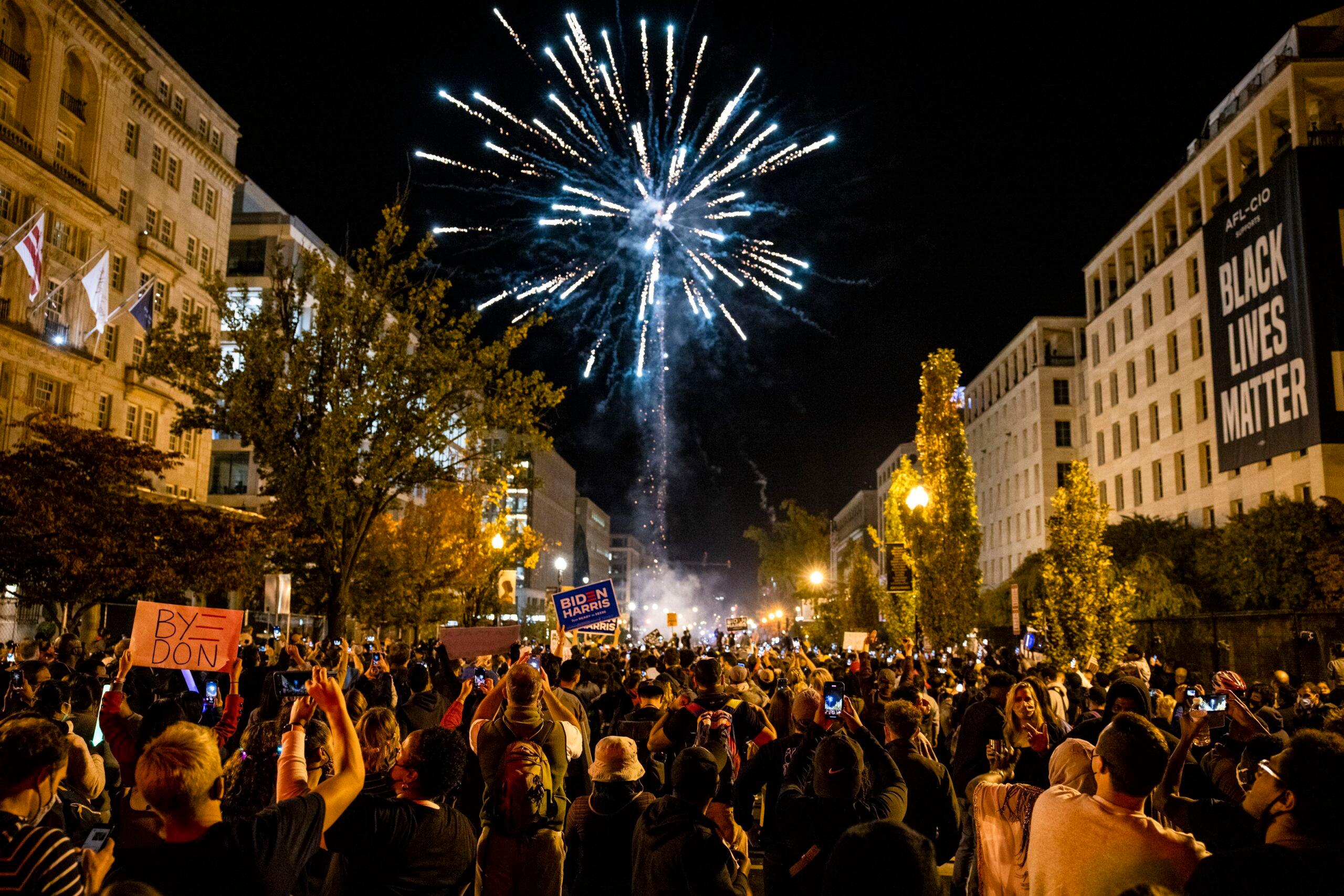 Word began to spread that Biden’s victory speech would soon start. People played the proceedings through speakers scattered around the area. At the far end of the Lafayette Square fence, a group of 24 people watched the news together on the same phone. A woman held her arm out and they all lined up, a bubble of bodies transfixed on the same glowing object. As Vice President-elect Kamala Harris’s speech wound to a close, her voice boomed: “And it is now my great honor … ” she said, pausing for just long enough to let the moment fill the air, “to introduce the President-elect of the United States of America: Joe Biden!” The people in front of the White House cheered. The sky above them crackled with fireworks.