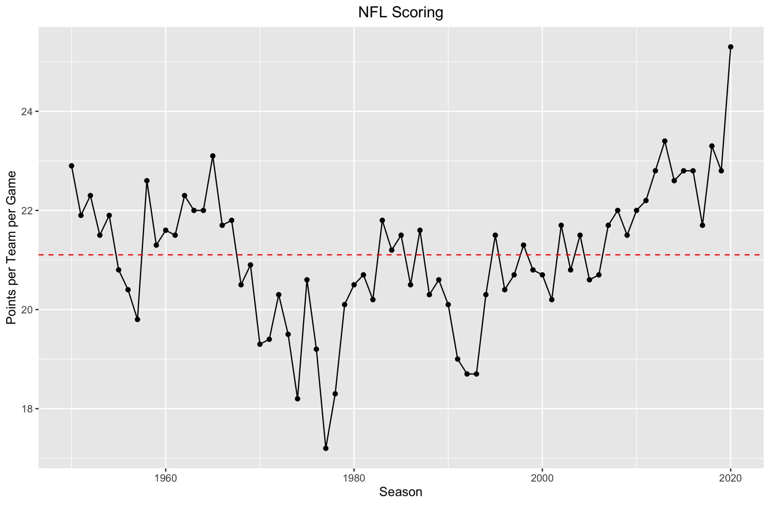 Check out 2020’s scoring spike on the graph below, which plots average team points per game for every season going back to 1950. The red line represents that average over that period, showing that the league has gradually increased scoring for years now—but there’s still nothing like the jump from 2019 to this season: