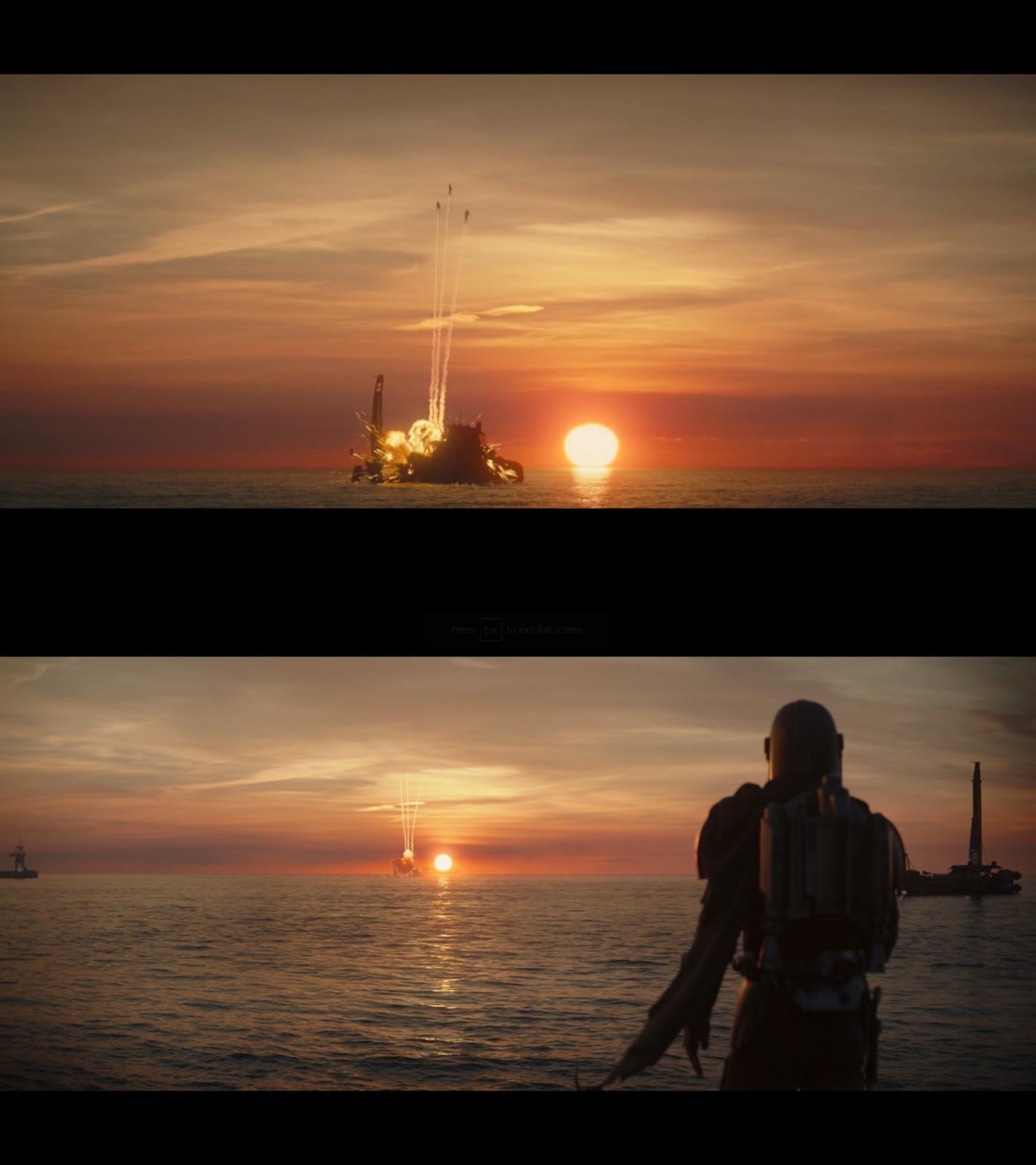 After Bo-Katan tells him that his life is a lie, Mando, in denial, sulkily jets off with the Child, leaving the blue-armored Mandalorians to blow up the trawler. Not to go all One Perfect Shot on you, but sometimes this series is really pretty.