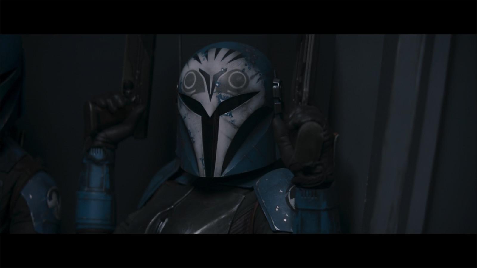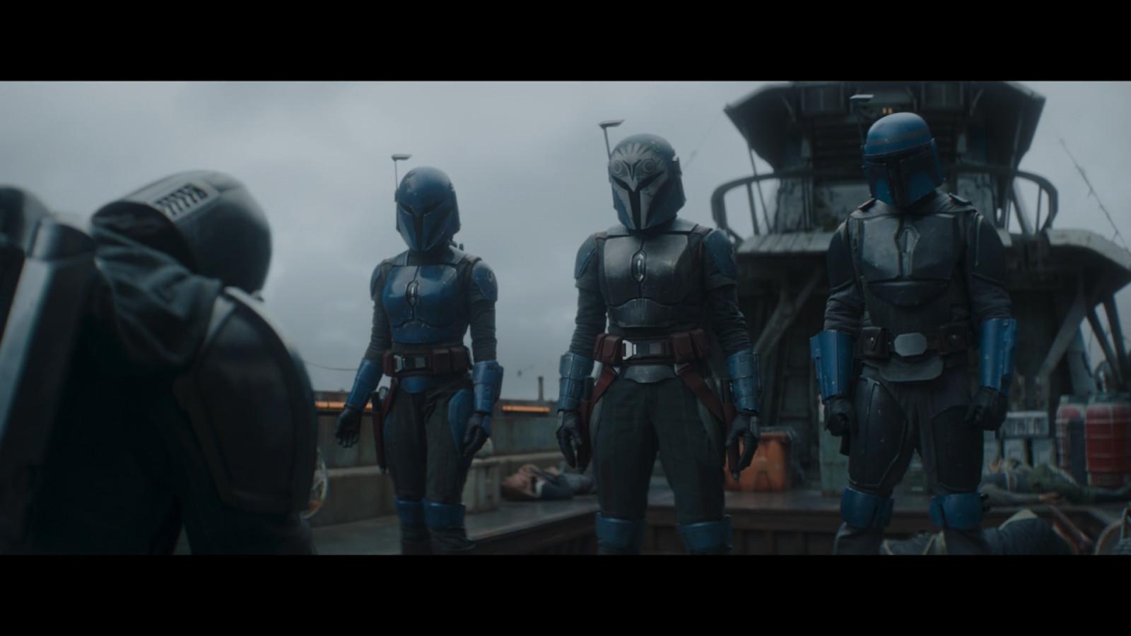 If you’ve watched The Clone Wars or Rebels or read casting rumors for Season 2, you probably recognized the Mandalorian leader as Bo-Katan Kryze. She’s flanked by Axe Woves (Simon Kassianides) and Koska Reeves (sighted earlier as a mysterious cloaked figure who had spotted Mando at the dock). Reeves is played by WWE’s Sasha Banks, credited here not by her ring name but by her real name, Mercedes Varnado. Bo-Katan, of course, is played by Katee Sackhoff, who voiced the character and inspired her likeness in both animated series. Her first live-action appearance looks a lot like her reintroduction in Rebels.