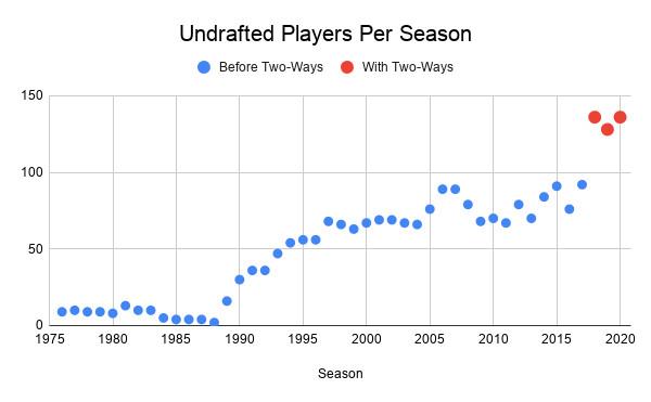 This graph shows the number of undrafted players appearing in at least one game in each season since the merger, with the seasons with two-way contracts colored red.
