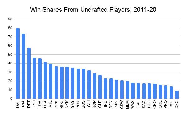 The teams with the best track record of developing undrafted players into viable parts of an NBA rotation look like the usual suspects, given which teams relied most heavily on undrafteds in the 2019-20 season. This graph shows the total win shares from undrafted players for each team over the last decade. It’s not a perfect measure of undrafted development because it includes players over their whole careers—so the Mavericks, for instance, get a boost from Wesley Matthews even though he first developed in Utah and Portland—but the top teams here track closely with those mentioned by team personnel as the role models in this area.