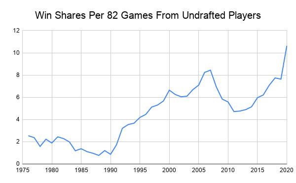 This breakthrough for undrafted players was an extension of a broader trend. An NBA record-tying 136 undrafted players appeared in at least one game in the 2019-20 regular season, and adjusting for the number of teams and games played, they were more productive than ever before. (This graph’s timeframe begins with the NBA-ABA merger.)