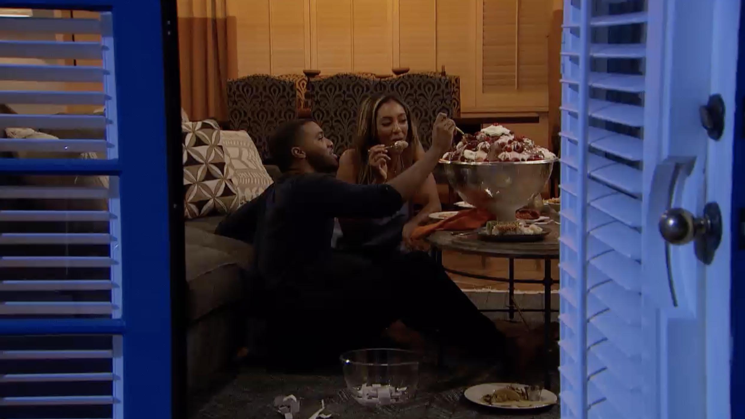 His prize is just getting to hang out in Tayshia’s apartment-sized hotel room—but the two seem to have a genuinely spectacular time. They pretend the floor is lava, have a giant, feather-flinging pillow fight, and order chicken tenders and a giant tub of ice cream from room service. It is the pinnacle of quarantine romance, and also what I imagined adults did on romantic dates when I was 6 years old.