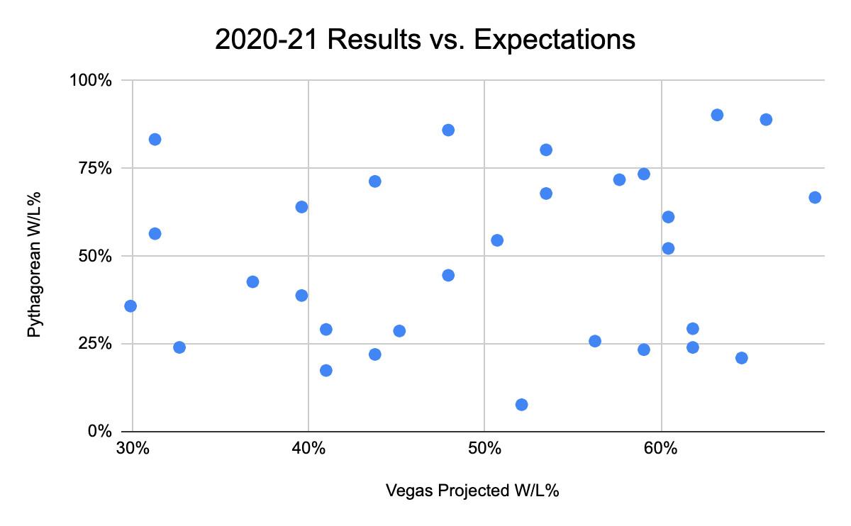 Just how bizarre have the early goings been? We can compare the standings to Vegas’s over/under preseason figures, which are normally reliable barometers for each team. Across the past 15 seasons, the correlation between teams’ Vegas-projected winning percentage and actual winning percentage is 0.76, on a scale in which 0 means no relationship and 1 a perfect relationship. That’s pretty good—and consistently so, as the correlation has been 0.66 or better every season in that span. (All preseason over/unders in this piece are from Sports Odds History and Basketball-Reference’s archives.)