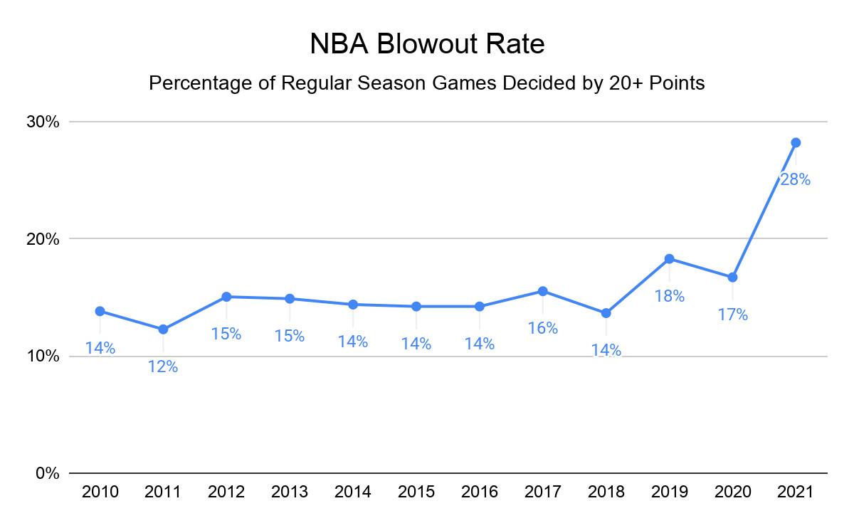 As the past two seasons demonstrate, blowout frequency was already on the rise because of the leaguewide scoring increase. It’s easier to win a game 120-100 than 100-80. (In the former, the victor needs to outscore the loser by 20 percent; in the latter, 25 percent.) But this season’s early rate goes well beyond that trend.