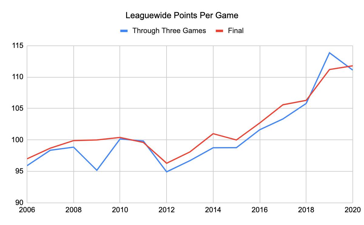How should we expect this number to change as the season continues? Even in a very small sample, there’s a lot of signal in this data. In the past 15 seasons, the league’s final scoring average has been one point per game higher than the average through three team games, and in 13 of those 15 years, scoring rose by at least a bit.