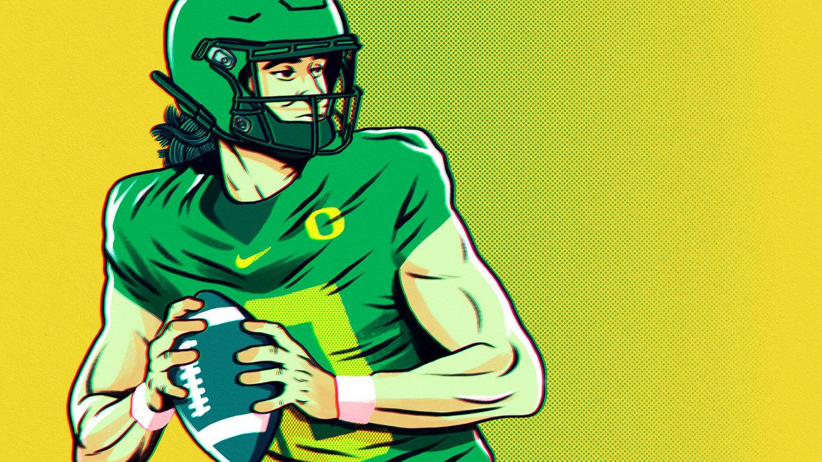 Herbert oscillates between superstardom and disaster, often in rapid succession. In Oregon’s matchup against Wisconsin in January, he was inch-perfect during his opening drive, completing four of five passes for 49 yards before stiff-arming his way in for the game’s first score. He painted corners, threaded passes, and put balls where only his receivers could find them. His only miss came when the ball shot through his intended target’s hands. This is Justin Herbert, the next great quarterback prospect.