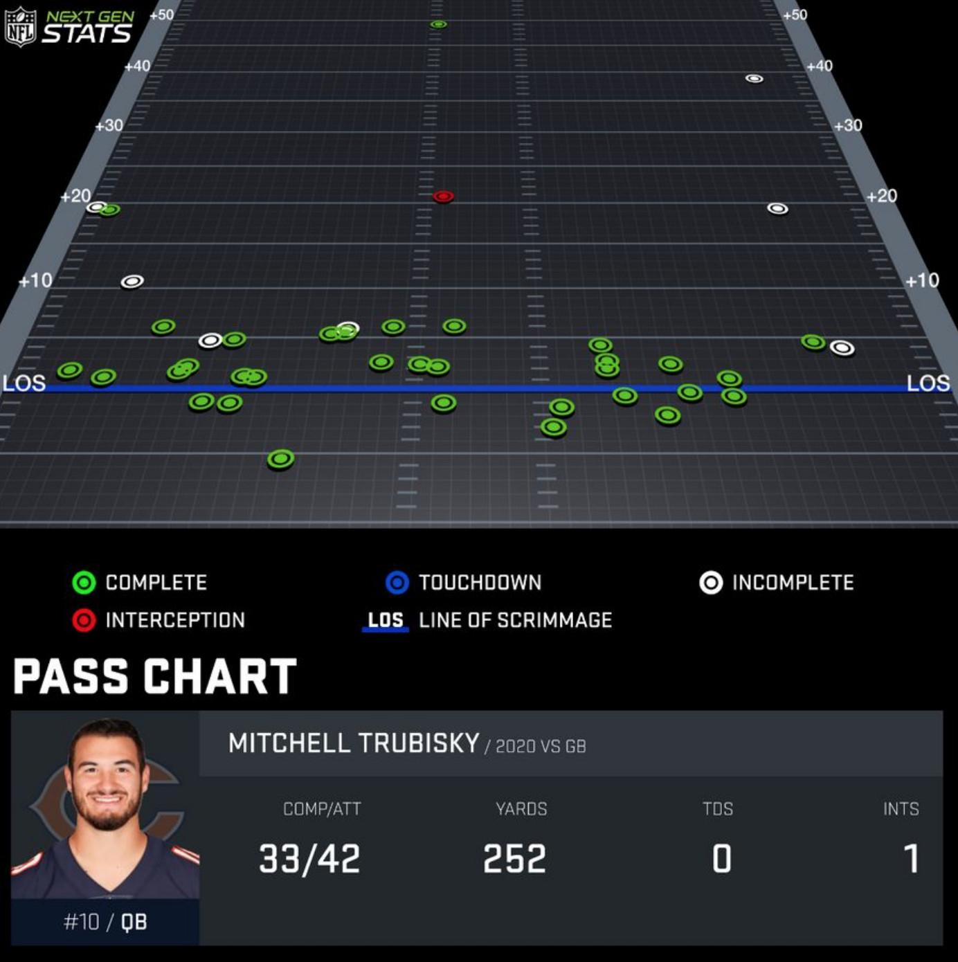 There’s no denying that the Bears offense has looked better and has functioned more effectively with Mitchell Trubisky back under center over the past six games. But there’s a pretty significant chasm between being better and being good, and we saw just how limited this team’s passing game is in Chicago’s loss to the Packers on Sunday. Trubisky finished 33-of-42 for 252 yards and an interception in the 35-16 loss. This pass chart from NFL Next Gen Stats tells a pretty vivid story about the Bears’ approach.