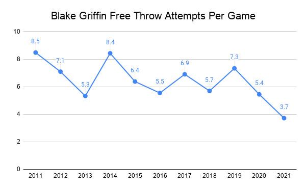 Griffin’s reduced activity level permeates all sorts of statistics. His usage rate of 20 percent is a career low by 5 percentage points. His drives per game have fallen, from 8.0 two seasons ago to just 2.4 now. Because he’s having trouble getting to the rim, he’s barely getting to the free throw line, either.
