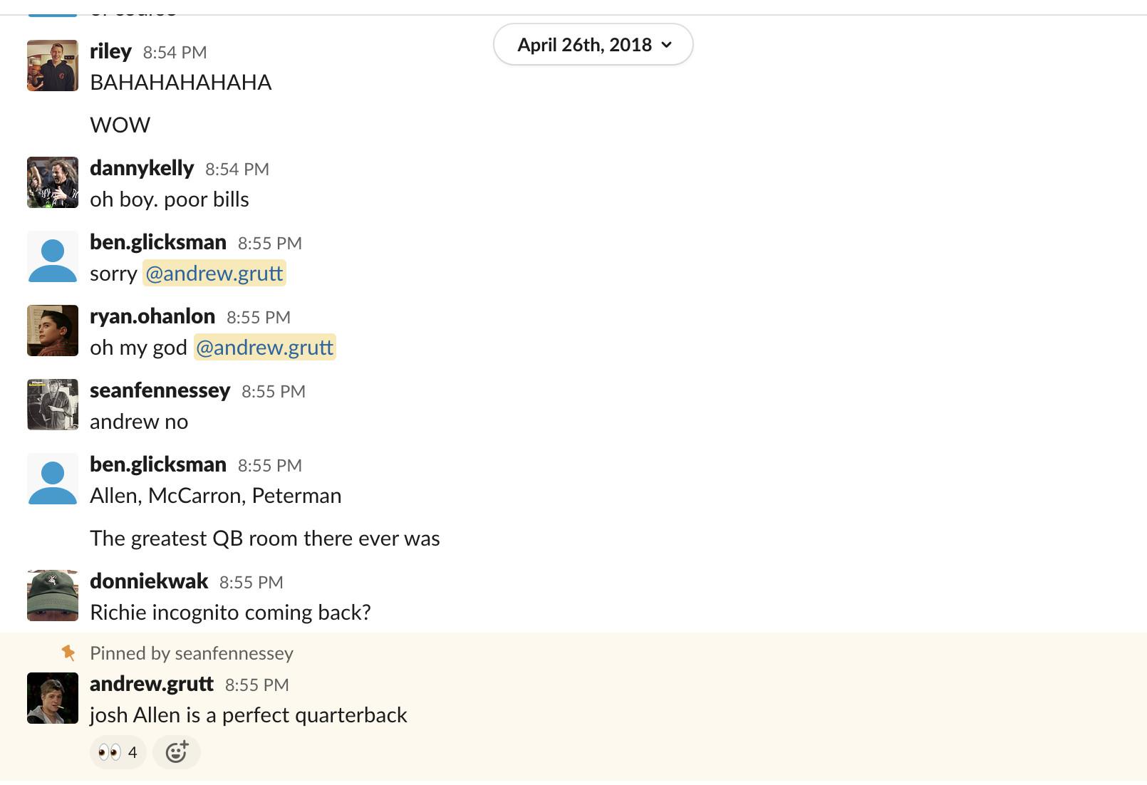 On April 26, 2018, I was sitting in a movie theater watching the Avengers get beat up by Thanos when my phone started exploding. That’s when I knew the Buffalo Bills had drafted Joshua Patrick Allen. Josh Rosen or Sam Darnold could never warrant so many notifications that it felt like there were multiple Amber Alerts going off simultaneously. With a delicate hand so as not to upset the Marvel stans, I reached for my phone. My friend had sent our group chat a video: “I’m dead inside,” he said into the camera before chugging an entire Labatt Blue. The Ringer’s NFL Slack channel had ignited into a celebration fueled by Bills schadenfreude. Swallowing hard, maybe fighting back a few tears, I typed the only thing I could think of: