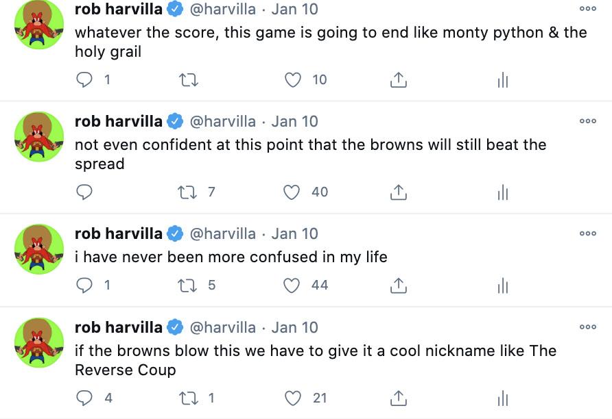 Forgive me and my fellow Browns fans as we revel in what is, for a great many other NFL fans, the familiar and even mundane sensation of making the playoffs, and winning a game in the playoffs, and gearing up to play another game in the playoffs. No idea how you Packers fans, or Saints fans, or (booooo) Ravens fans handle this. What does not appear newsworthy or even all that noteworthy to you is, to us, an ultrarare and joyously cataclysmic event, a total solar eclipse. I spent Sunday swigging Emergency G&Ts and bulk-tweeting the dumbest crap imaginable. Look at this. This isn’t even close to all of it.