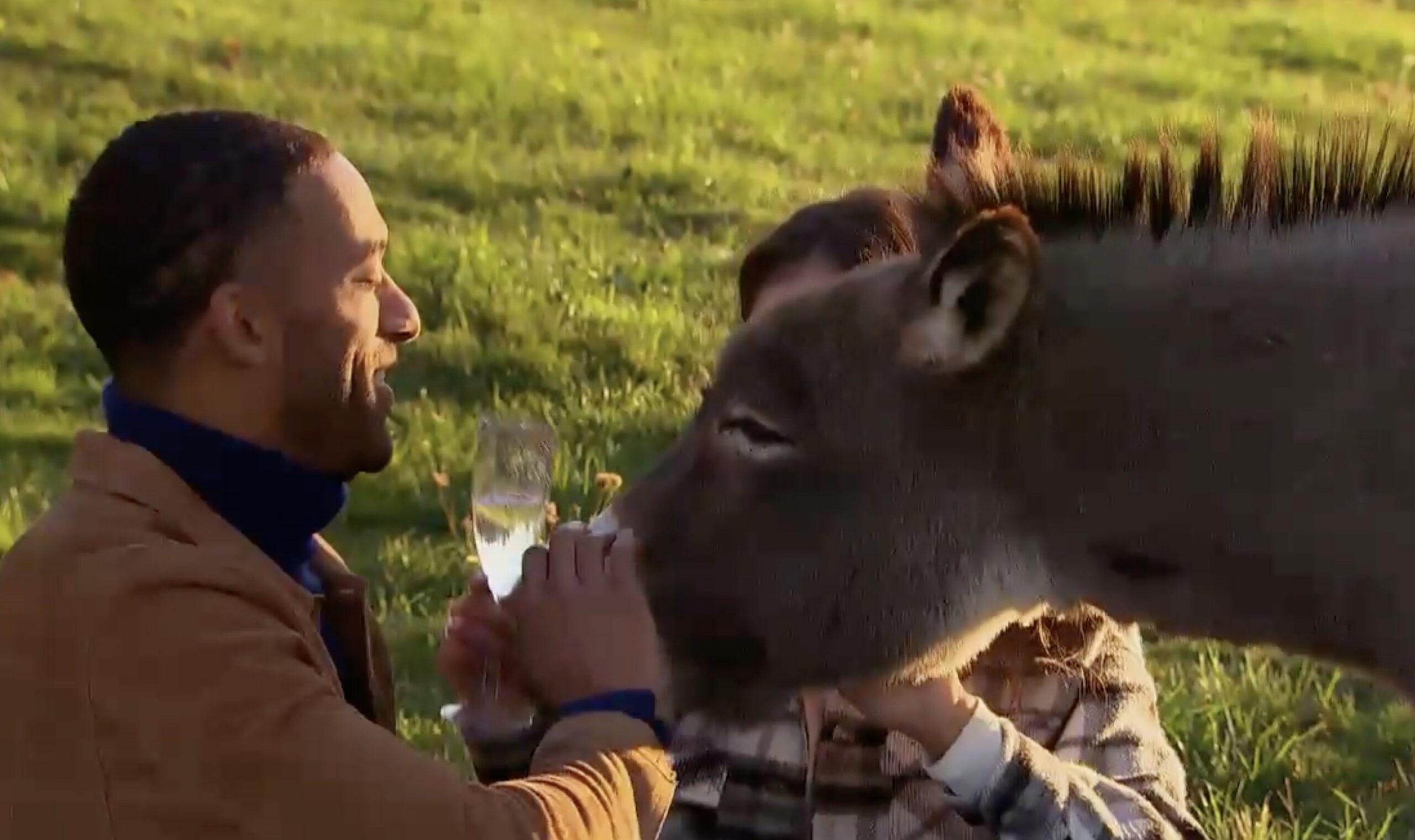 The two also go horseback riding through the Pennsylvania woods, and unlike last week’s ATV rides, there are no near-death experiences. Afterward, they sit down in a pasture filled with animals to try to have a normal date. But after roughly 35 seconds of conversation, they are interrupted by a herd of donkeys. (A donk of donkeys?) It feels too coincidental that the donkeys arrive at almost exactly the moment their conversation gets serious—either they were intentionally released by Bachelor producers at the correct moment, or they smelled the charcuterie board. But I really cannot stress enough how surrounded Matt and Serena were by donkeys.