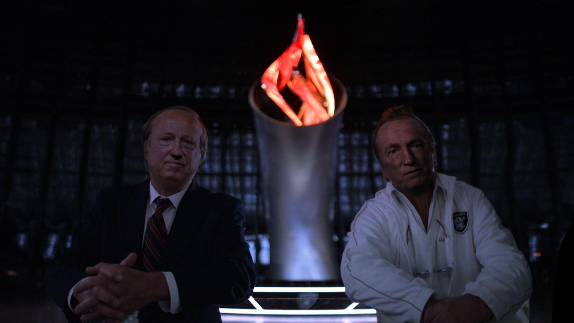 When I say deepfakes—well, I mean deepfakes. Rozelle passed away in 1996, Davis in 2011. They appear throughout the documentary as CGI reanimations of their former selves, pacing around the Raiders’ new stadium in Las Vegas—which, needless to say, was a big ol’ pit of sand during both men’s lives. (Did you think the league would pass up a promotional opportunity? Sin City, baby!) Things get weird immediately: While the deepfakes aren’t present in the official trailer, it takes less than a minute to get to a creepy, uncanny-valley version of Davis loitering around the Vegas stadium’s upper deck—in front of the 85-foot memorial torch built in his honor.