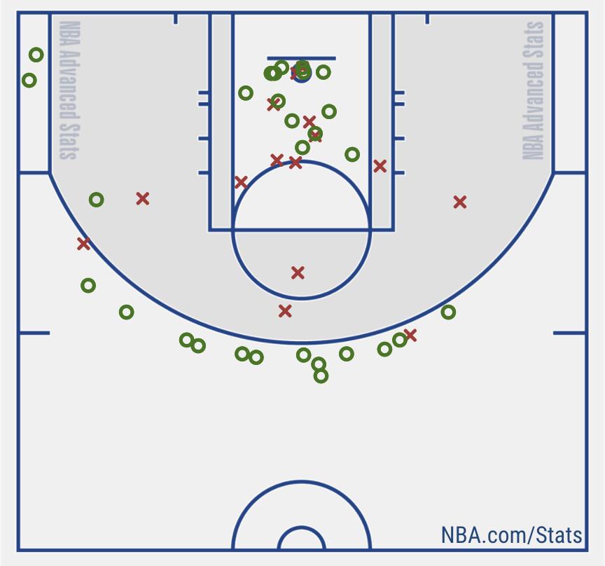 Little did they know they were walking into a flood. The Nuggets deluged the scorching Jazz with triple after triple, taking a 25-point lead into halftime thanks to 15-for-17 shooting on 3-pointers. Their first-half shot chart is hilarious.