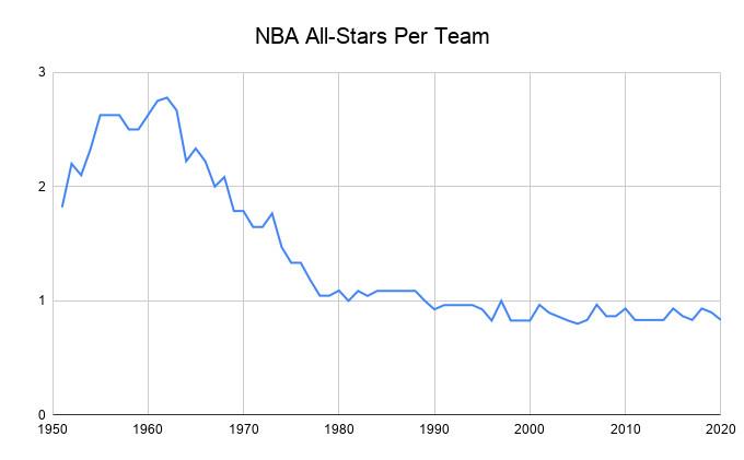 Because the All-Star roster size hasn’t changed while the league has vastly expanded, the game has become much more exclusive. Back in the 1960s, each team averaged multiple All-Stars; in a 30-team league, however, teams don’t even average one honoree apiece, even with injury replacements. Thus, all the best players to never make an All-Star team played in more recent decades. (Apologies to Celtics forward and future Hall of Fame coach Don Nelson, the best non-All-Star in this early period.)