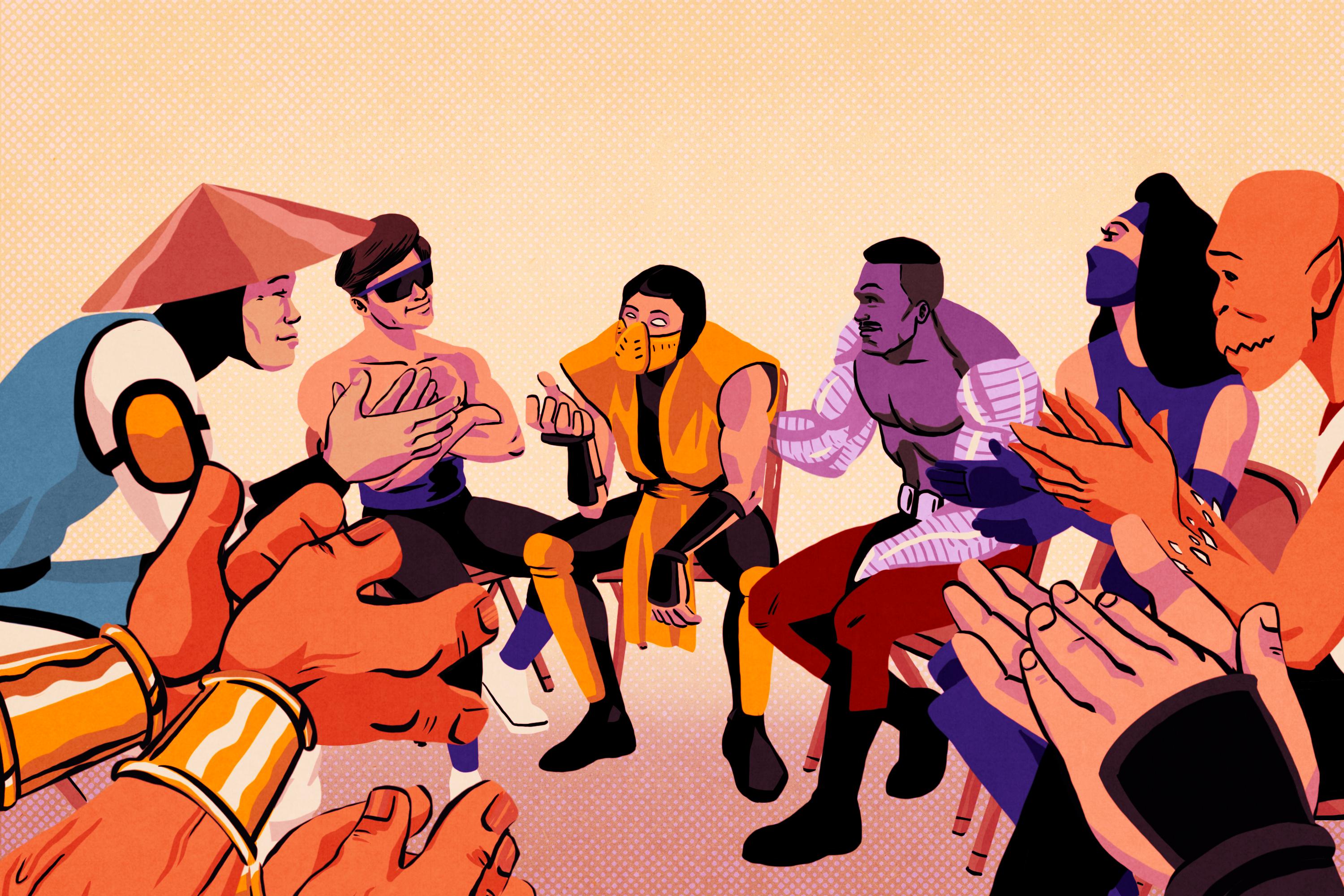 Eleven of the 12 playable characters from Mortal Kombat 2—Baraka, Jax, Kitana, Kung Lao, Liu Kang, Mileena, Raiden, Reptile, Scorpion, Shang Tsung, and Sub-Zero—mill about a Knights of Columbus hall. The only one missing is Johnny Cage. They pick at a spread of finger foods located on a table near the entrance. The group is clearly restless. The meeting was supposed to start 22 minutes ago.