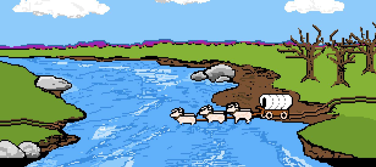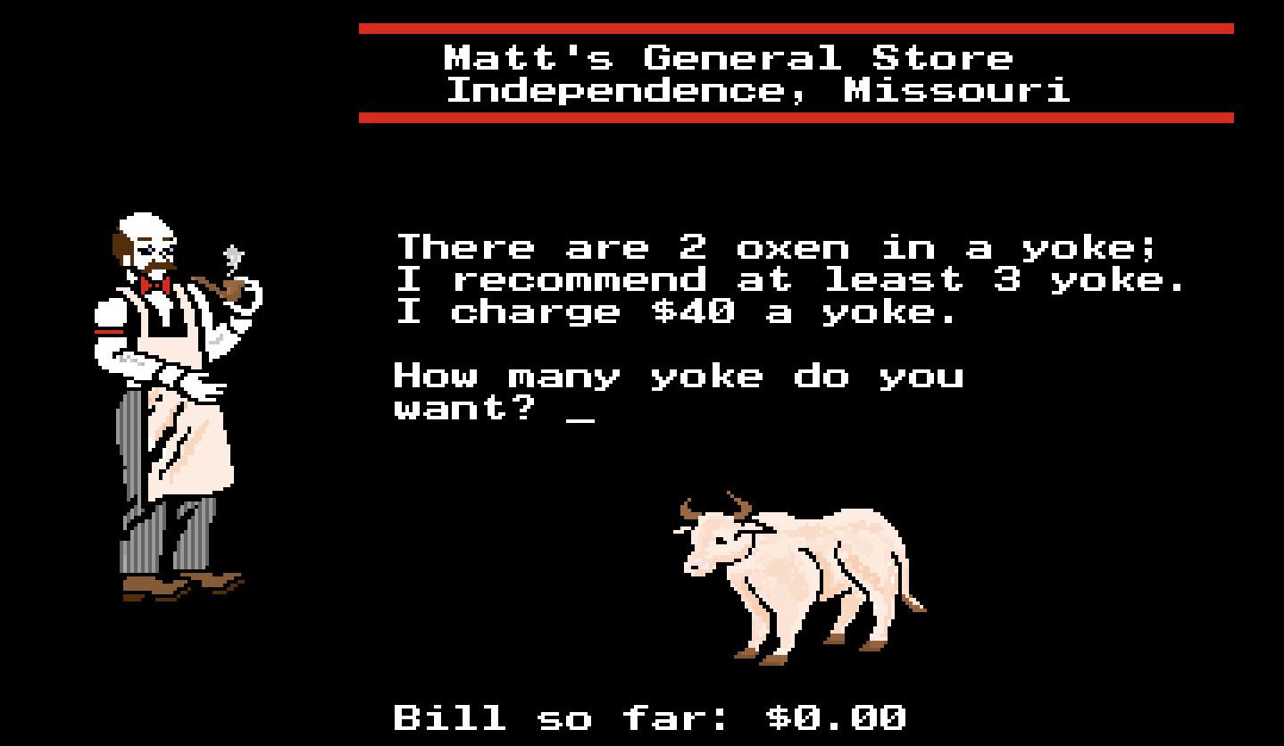 More than anything, though, the oxen are a constant reminder of the pioneer’s finite resources. Both a crutch and a curse, they are the pioneer’s gasoline. According to the owner of the local general store, “a team of oxen to pull your wagon” is an Oregon Trail must-have. And, much to the chagrin of the budget-conscious farmer, the same store owner also charges $40 per pair, or yoke, and—deploying the same tone a waiter at a tapas restaurant uses to pressure you into ordering more food—recommends at least three yokes for a westward journey. The lowly farmer has no choice but to forgo sets of clothing that could keep his family warm for . . . some especially buff cows. And that’s just the beginning.