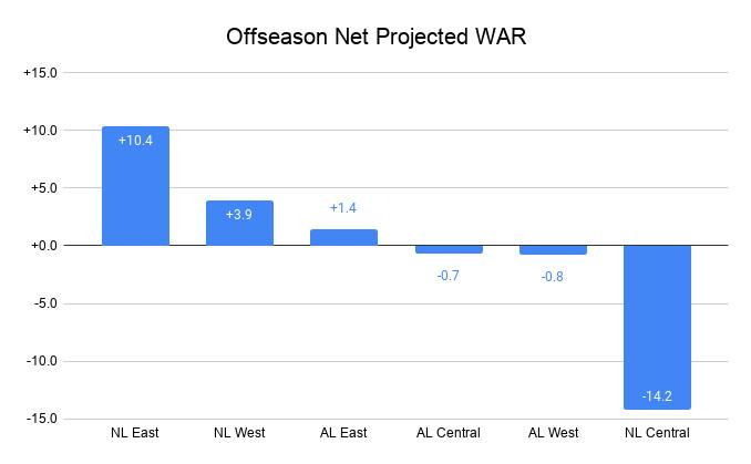 At least some of the AL Central clubs took steps to course-correct during the offseason. The Twins signed Andrelton Simmons; the White Sox signed Liam Hendriks and traded for Lance Lynn; the Royals and Tigers completed a host of mostly under-the-radar acquisitions. Yet while the NL Central was already—probably—bad, during the winter, it got a lot worse. This graph shows the combined projected 2021 WAR totals for every player who changed divisions this winter, according to FanGraphs’ projections and transactions tracker. Guess which division comes in last!