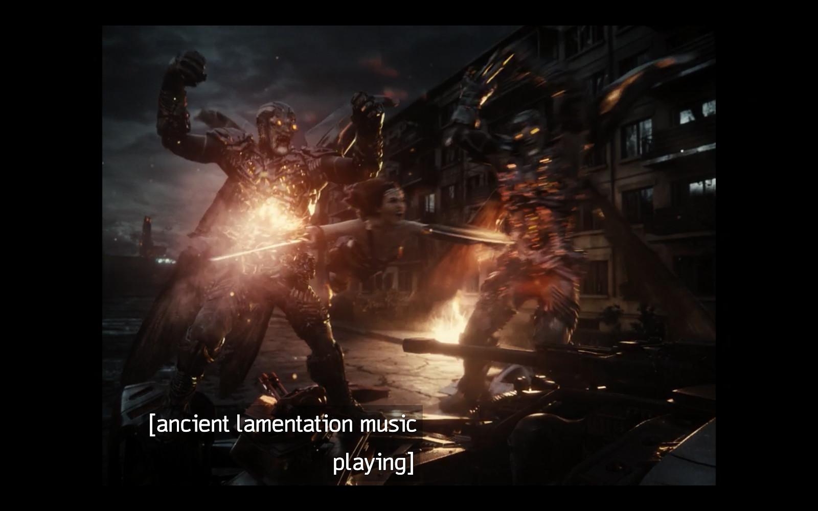 The S-MHDS arrives more than an hour into our journey (we’re already on Part 3), and introduces us to pretty much the sole character (Ezra Miller as the Flash) meant to serve as comic relief. For that matter, it’s pretty much the sole extended scene that is meant to be funny on purpose, and even this scene is soundtracked by an extra-lugubrious cover of the morose Tim Buckley jam “Song to the Siren,” but it is still, as previously mentioned, fuckin’ hilarious. Legit, unqualified LOLs. Zack Snyder’s Justice League is dominated by the same unrelenting gray color palette as Snyder’s previous DCU movies, a comically grim self-seriousness, and an extra-punishing length, but the Flash’s one lovelorn burst of slo-mo self-pity—the pretty girl, the car wreck, the finger-smashed glass, the time-stopping reverie, the explosion, the hot dog plucked from the air as though a daisy in a verdant field—is just the jolt of mostly on-purpose goofiness Snyder needed, or at least we needed, to really tie the room together. By this point—barely a quarter of the way through this goddamn thing—you are attuned to the Snyder Cut’s rhythm, or its brash resistance to any consistent rhythm whatsoever. You bought the ticket. You’re taking the ride. And quite possibly, you’re (intermittently!) enjoying it.