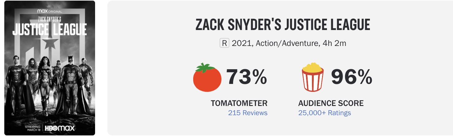 OK, sorry, so obviously this is a screenshot of the Rotten Tomatoes score for Zack Snyder’s Justice League, but admit it: This is astounding. A Zack Snyder film that critics enjoyed, or at least grudgingly appreciated. The San Francisco Chronicle conceded that “it may not be a great film, but it has the madness, strangeness, and obsessiveness of a real work of art.” Indiewire granted that Snyder’s “maximalist approach may repel as many people as it delights, but certainly delivers a genuine cinema of attraction for those who demanded it in the first place.” Vulture concluded that “the Snyder Cut has its share of problems—when you get the best of Snyder, you also get the worst—but it’s an undeniably passionate and moving work. It earns its self-importance.” NPR: “It actually succeeds.” Vanity Fair: “intermittently rewarding.” The Jewish Chronicle: “surprisingly enjoyable.” Qualified praise: It’s still praise.