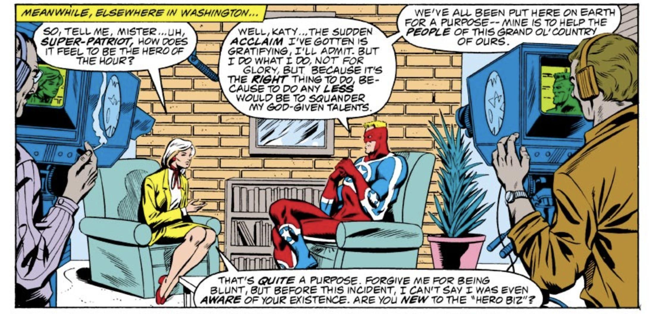 Like it did with Karli and her Flag-Smashers, The Falcon and the Winter Soldier is pulling from elements of John Walker’s history in the comics while also taking some notable departures to better fit within the context of the MCU. In the comics, Walker—who made his debut in Captain America no. 323 in 1986—is still an Army veteran from Custer’s Grove, Georgia, but not a war hero worthy of three Medals of Honor. In an effort to become a greater hero, Walker successfully undergoes a risky procedure that grants him superhuman strength, a potentially fatal process made possible by a shady businessman known as the Power Broker. After briefly considering a career in professional wrestling (seriously), he takes on the persona of the Super-Patriot and publicly challenges Captain America, arguing that the country deserves a new, younger hero who might better reflect its shifting ideals in the modern era. Before long, Steve Rogers grows tired of being the government’s pawn and hands in his shield. The Super-Patriot, meanwhile, gains public favor by preventing an attack on the Washington Monument (it’s always the Washington Monument), and even makes a TV appearance shortly before taking on the Captain America mantle.