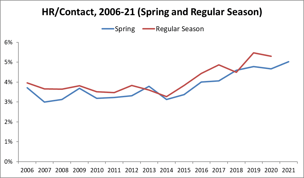 If we compare how many homers were hit per batted ball, rather than per game, then we don’t have to worry about confounding factors caused by decreased contact or by MLB’s recent resemblance to Calvinball. The chart below displays spring-training and regular-season HR/Contact rates in each season since 2006 (the earliest spring data available via MLB’s public records).