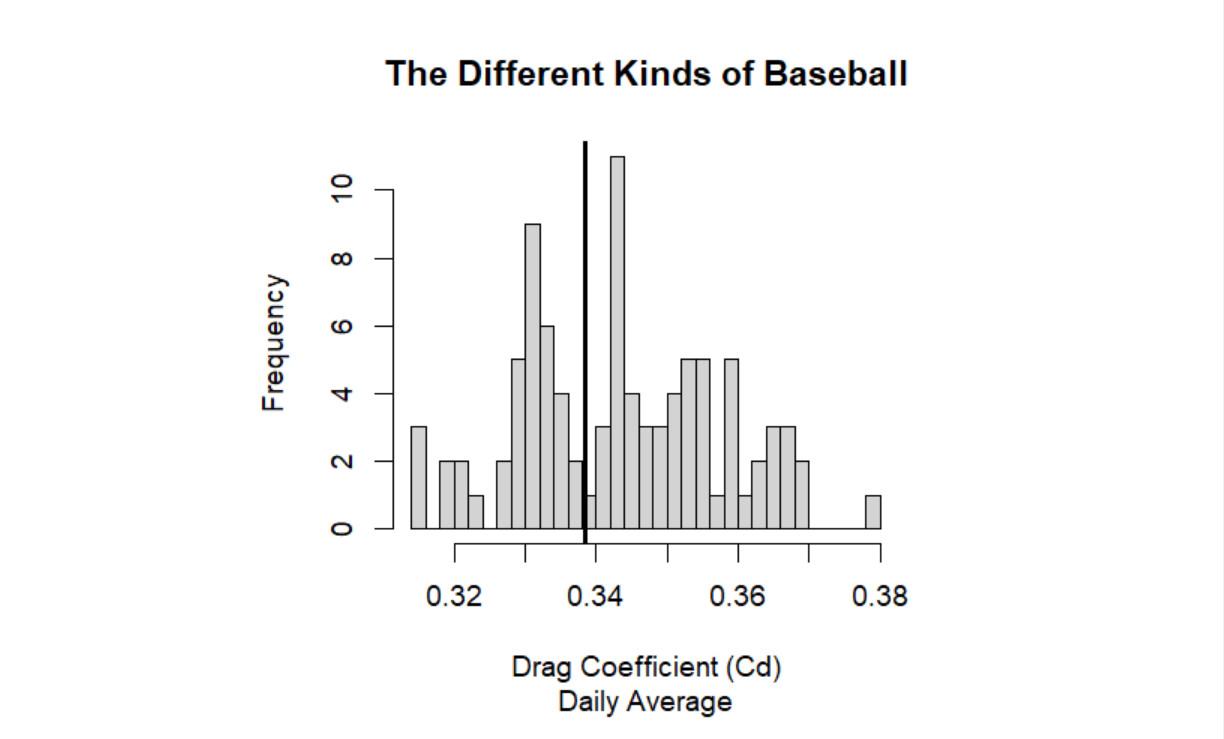 If we graph the daily drag averages of all balls thrown this spring, we see what appears to be a bimodal distribution with two apparent peaks—in other words, possible evidence of two different balls with distinct drag coefficients. This split between balls is much more pronounced than it has been during the regular season, when only one kind of ball is supposed to be used. Dr. Alan Nathan, an expert on the physics of baseball who has chaired the MLB-commissioned committee’s investigations about the ball, says that he’s also seen a higher standard deviation in the daily drag averages than he has in any of the past few regular seasons, which could be indirect evidence of balls sampled from two distributions.