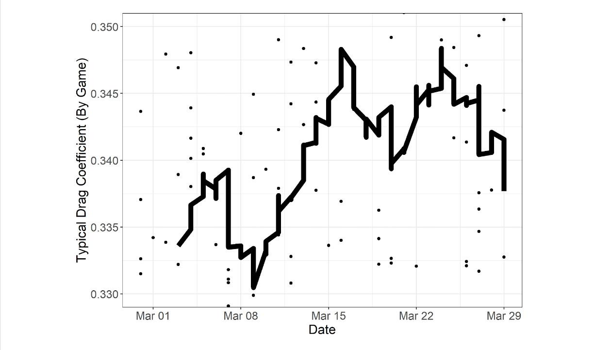 Knowing that there may be more than one model of the baseball in use this spring—one with higher drag, one with lower drag—doesn’t help us much unless we can figure out which one is old and which one is new. If we arrange the average drag coefficients for each day in chronological order, we find that as spring training has gone on, the drag has increased (which Nathan has noticed too).