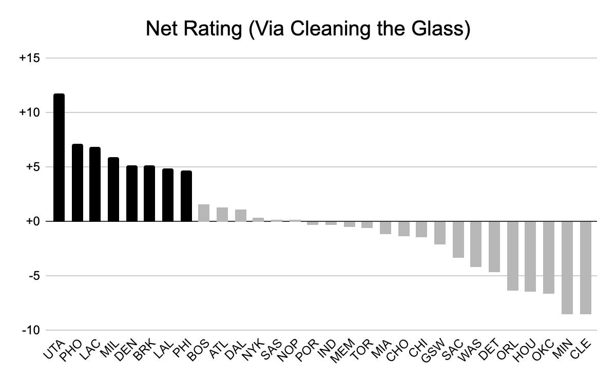 This season, the league also has a 22-team tier and an eight-team group—but unofficially, and with the figures reversed. Right now, eight teams are head and shoulders above the rest of the league. Look at the size of the drop between the eighth-place 76ers and ninth-place Celtics in this graph of net rating, with garbage time removed: Boston is closer to the 21st-place Bulls than the 76ers.