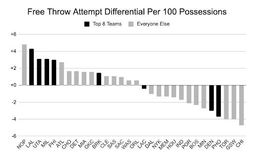 As a team, the Suns rank 29th in free throw rate, and they’re taking 3.7 fewer free throw attempts per 100 possessions than their opponents, the worst mark among the top eight teams. For comparison, the Lakers are at plus-4.3 on the season—meaning in a potential playoff game between these teams, the reigning champs could average eight extra free throws per game, a massive boost.