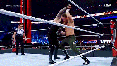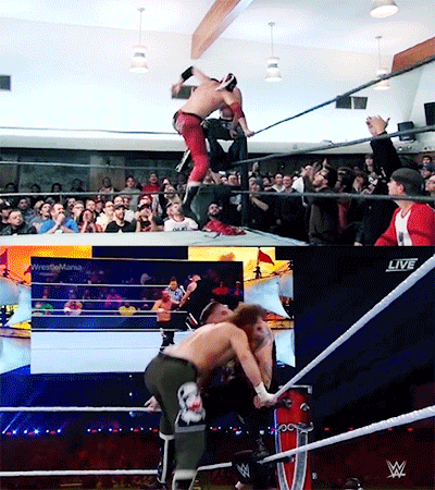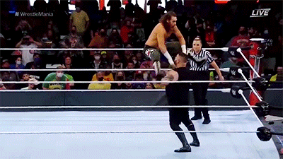 As the WrestleMania match progresses, it’s as if the wrestlers are shifting backward through time, move by move. Zayn responds to Owens’s failed powerbomb with that brainbuster onto the apron, the viciously beautiful signature move of El Generico that he was forced to use over and over again to try to keep his bloodthirsty former friend Steen down.