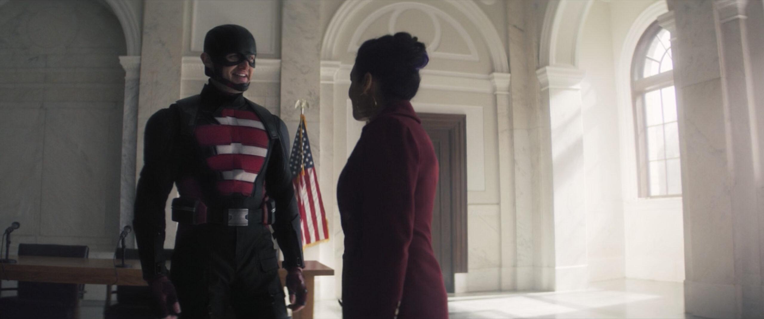 Despite playing it cool for much of the episode (save for his corny use of an Abraham Lincoln quote that probably made Bucky want to hurl), Walker can barely contain his excitement when appointed to this role—just look at that grin on his face in the screenshot above. Walker has finally donned his U.S. Agent costume and moniker from the comic books, and his partnership with Valentina marks a new beginning for him in the MCU—it seems likely that we’ll see actor Wyatt Russell in future Marvel series or films. In the comics, the U.S. Agent is a more violent version of Captain America, who toes the line between hero and villain. We’ve already seen as much from Walker in Falcon after he brutally executed a Flag-Smasher in one of the more shocking moments of the season.