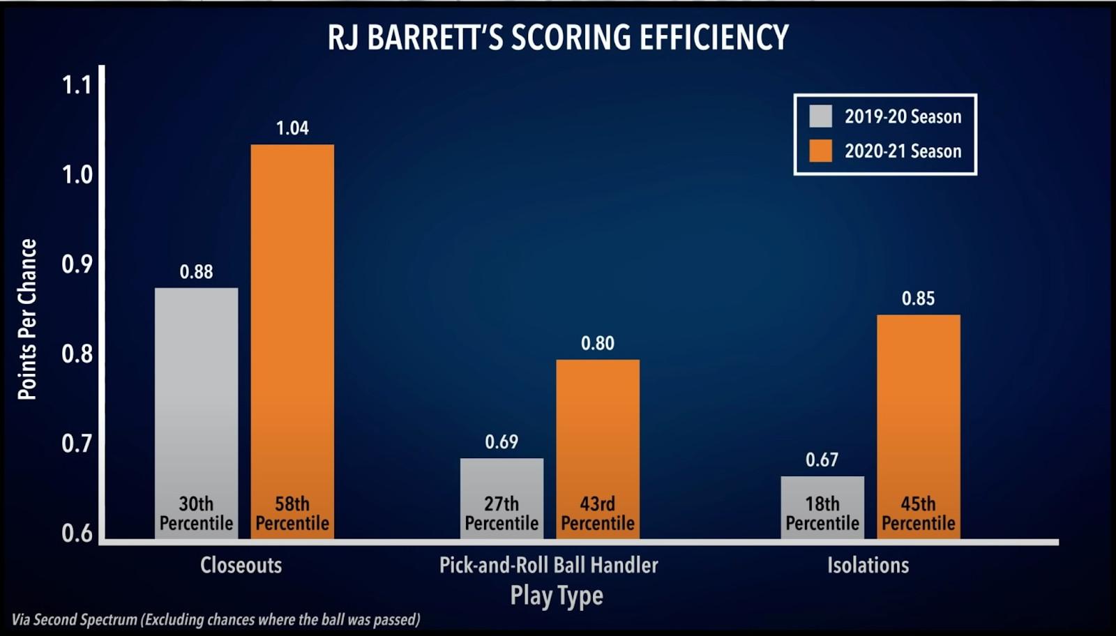 Barrett grades higher across play types, as detailed in the chart above taken from the latest episode of The Void (with stats not including Saturday’s win over Toronto). This season, Barrett is doing a better job of mixing in change of pace, utilizing his off-hand, and using floaters. He is a long way from being a great interior scorer, but his progress is a sign that even better days are ahead.