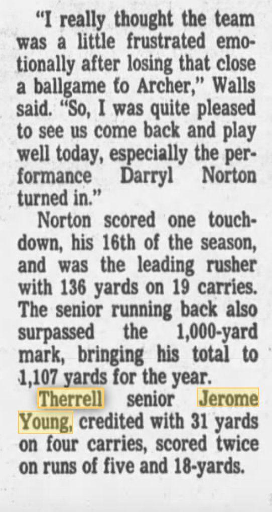 While at D.M. Therrell, Young had a measure of success on the gridiron, backing up future Georgia Tech starter Darrell Norton on offense and starting on defense. He showed a talent for pass coverage and attracted interest from regional football programs like North Carolina A&T.