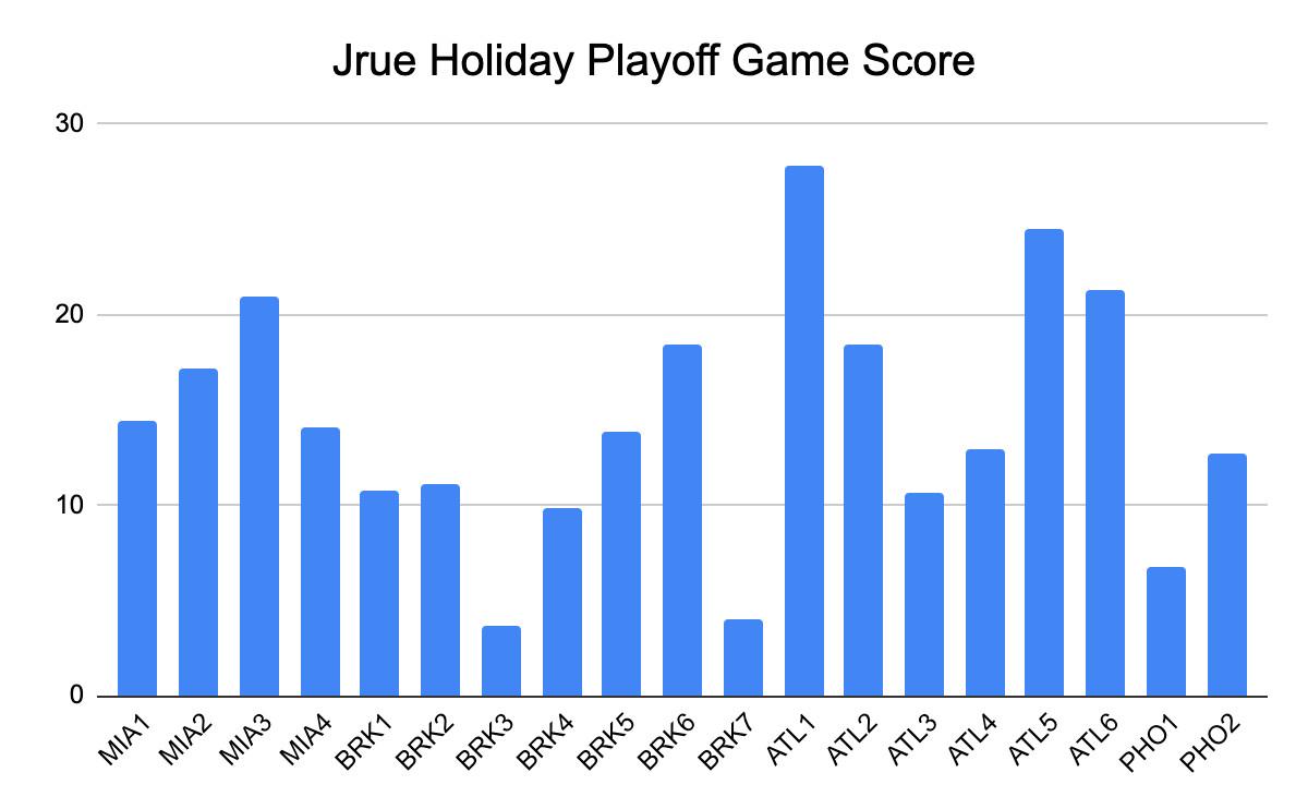 Then, on an individual basis, the Bucks need more from the supplementary stars surrounding Giannis. Holiday has looked downright reminiscent of Eric Bledsoe at points this postseason, with erratic game-to-game numbers leading to two porous Finals performances in a row. Holiday is shooting just 31.4 percent in the Finals so far; this graph shows how up and down he’s been since the Bucks coasted to a first-round sweep over Miami. Milwaukee needs him to return to the lofty level at which he played to close out the Hawks in the Eastern Conference finals to have a chance in this series.
