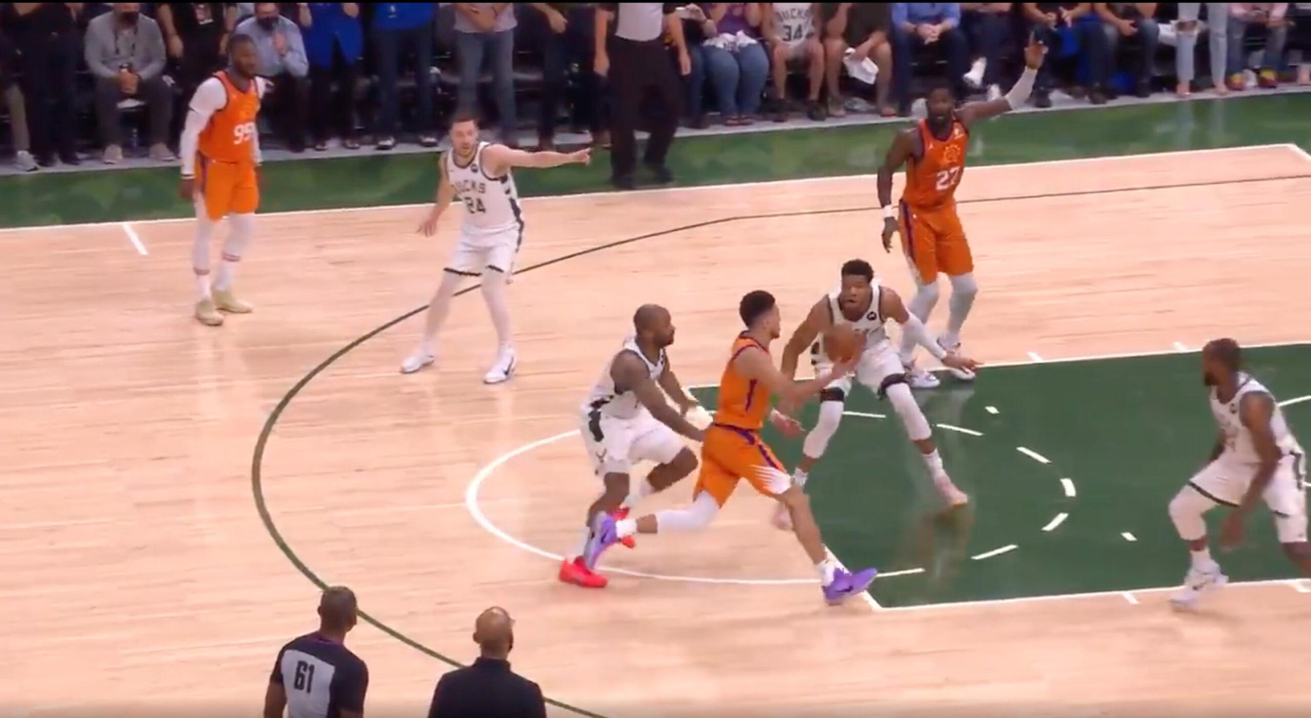 Guarding Deandre Ayton at the top of the key, Giannis hedged after a handoff to Devin Booker and stuck to the top-right corner of the paint. Ayton, meanwhile, rolled uncontested to the left, and Booker threw a lob toward the open man. At the moment Booker released the ball, Giannis still had one foot on the free throw line: