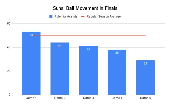 The Suns were right in line with precedent in Game 1, with 53 potential assists—only to see that figure drop with every successive game, down to a nadir of just 29 in Game 5, the team’s lowest in any game all season.
